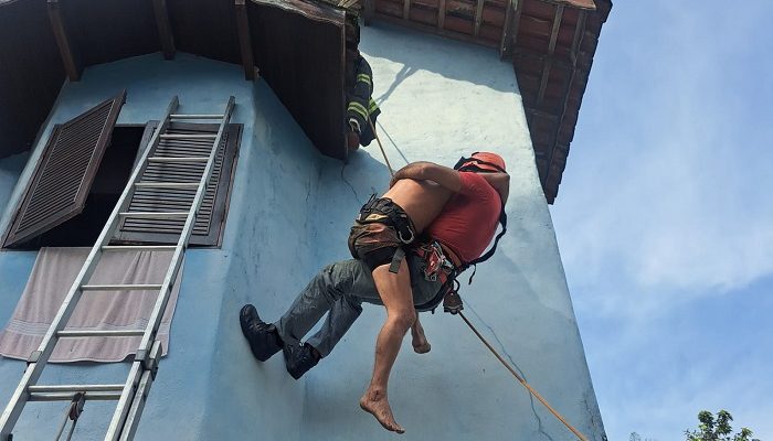 Diante da situação, os bombeiros montaram um sistema de rapel para realizar o resgate com segurança. Um dos agentes subiu até o telhado e efetuou a descida controlada junto à vítima.