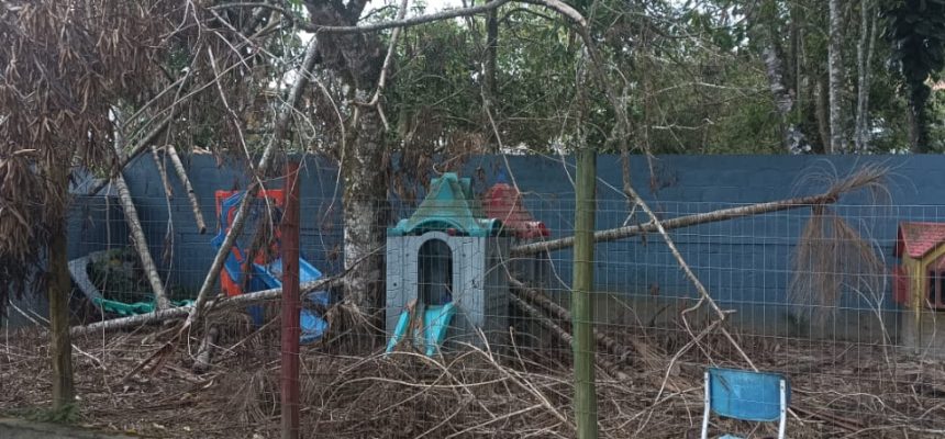 O parquinho da Escola Municipal Renata Castilho, no bairro Saco da Ribeira, permanece interditado há cerca de 23 dias, após os fortes vendavais que atingiram Ubatuba no dia 8 de novembro. Desde então, galhos, troncos e brinquedos danificados se acumulam na área destinada às crianças, que estão sem acesso ao espaço de lazer neste último mês de aulas.