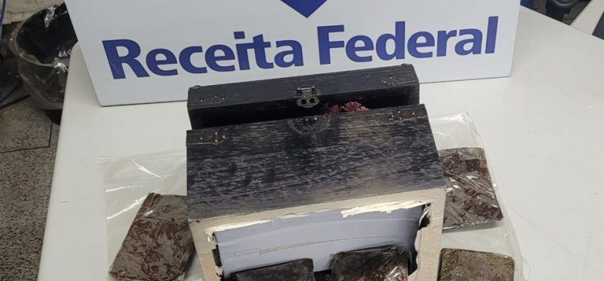 De acordo com o órgão, o haxixe, resina da maconha, foi identificada após revista no equipamento de raio-x que verifica encomendas postadas. A bagagem tinha 910g da droga.