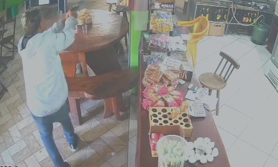 Nas imagens é possível ver a hora que um homem se aproxima do balcão, saca uma arma de fogo e surpreende, o homem do outro lado do balcão, com tiros. O dono do estabelecimento entra em um cômodo, também pega uma arma e o tiroteio começa.